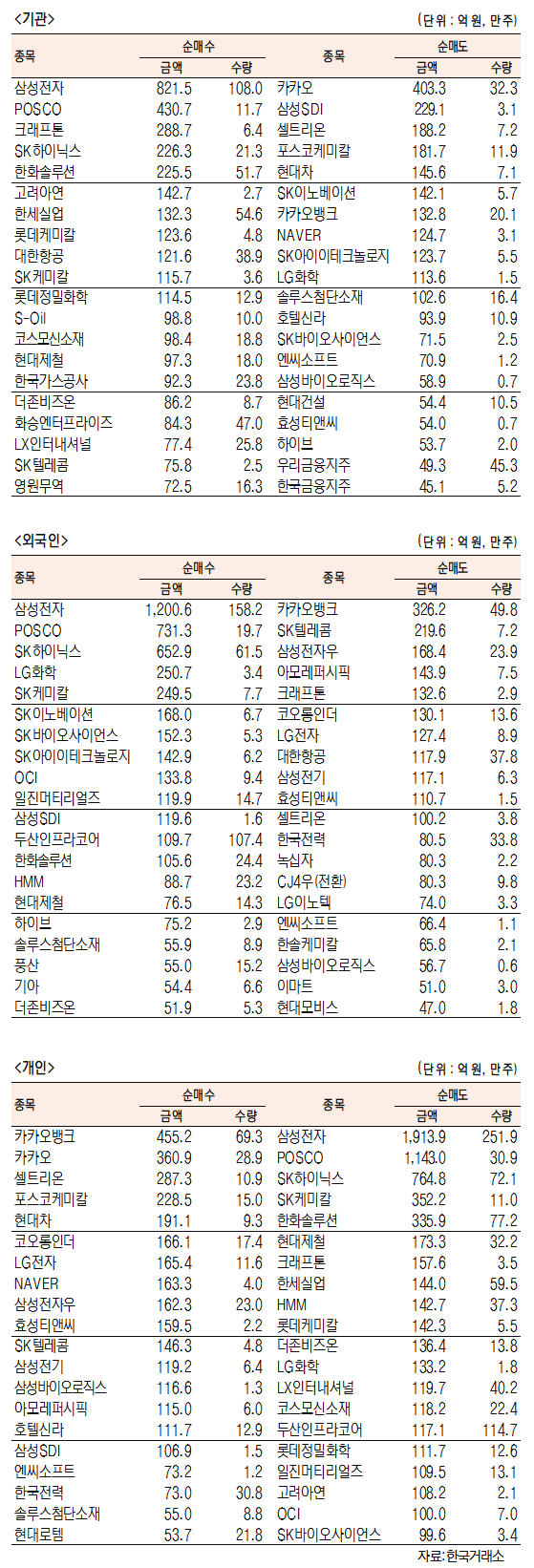 [표]유가증권 기관·외국인·개인 순매수·도 상위종목(9월 13일)