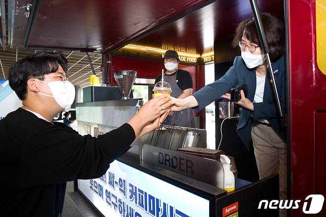 (서울=뉴스1) = 임혜숙 과학기술정보통신부 장관이 13일 오후 대전광역시 유성구 연구개발특구진흥재단에서 열린 '연구개발특구 소재 청년 창업기업 대표자 간담회'에서 '응원커피'를 전달하고 있다. (과학기술정보통신부 제공) 2021.9.13/뉴스1