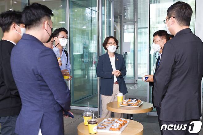 (서울=뉴스1) = 임혜숙 과학기술정보통신부 장관이 13일 오후 대전광역시 유성구 연구개발특구진흥재단에서 열린 '연구개발특구 소재 청년 창업기업 대표자 간담회'에서 '응원커피' 를 전달한 뒤 대화하고 있다. (과학기술정보통신부 제공) 2021.9.13/뉴스1