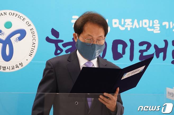 (서울=뉴스1) = 조희연 서울시교육감이 13일 오후 서울 종로구 서울시교육청에서 전국시도교육감협의회-교육부-환경부 공동으로 진행하는 일상 속 기후행동 약속과 실천을 위한 '2021 환경공동선언'에 참석하고 있다. (서울시교육청 제공) 2021.9.13/뉴스1