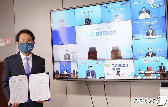 (서울=뉴스1) = 조희연 서울시교육감이 13일 오후 서울 종로구 서울시교육청에서 전국시도교육감협의회-교육부-환경부 공동으로 진행하는 일상 속 기후행동 약속과 실천을 위한 '2021 환경공동선언'에 참석하고 있다. (서울시교육청 제공) 2021.9.13/뉴스1