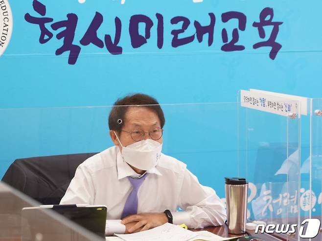 (서울=뉴스1) = 조희연 서울시교육감이 13일 오후 서울 종로구 서울시교육청에서 온라인으로 진행된 제80회 전국시도교육감협의회에 참석하고 있다. (서울시교육청 제공) 2021.9.13/뉴스1