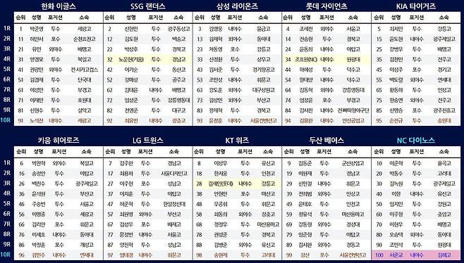 2차 지명에선 총 100명이 프로 입단을 하게 됐다. 지난해 팀 순위 역순인 한화-SSG 랜더스-삼성 라이온즈-롯데 자이언츠-KIA 타이거즈-키움 히어로즈-LG 트윈스-kt wiz-두산 베어스-NC 다이노스 순으로 지목했다.