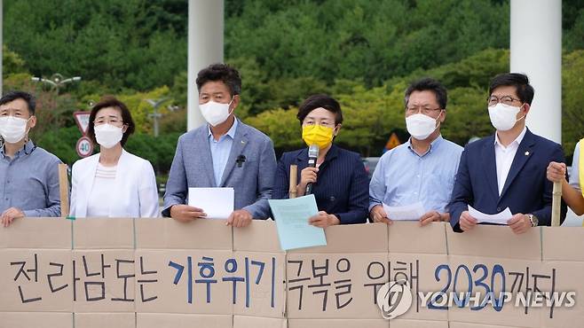 (무안=연합뉴스) 여운창 기자 = 2030년 온실가스 감축목표와 이행계획 수립을 촉구하는 기자회견이 13일 정의당 여영국 대표가 참석한 가운데 전남도청 앞 광장에서 열렸다. 2021.9.13 [정의당 제공·재판매 및 DB 금지]