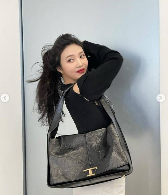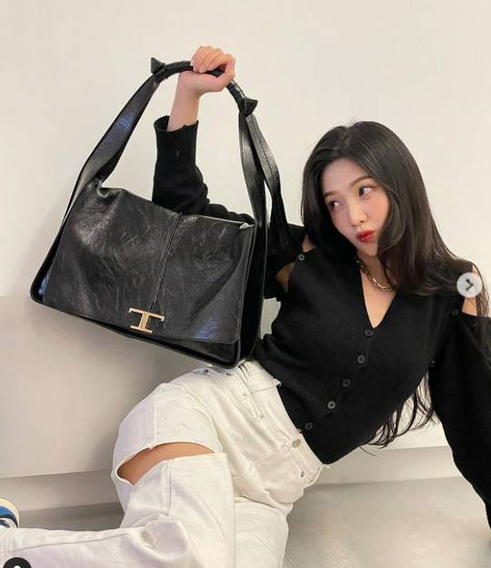 공개된 사진 속 조이는 T사 숄더백을 들고 다양한 포즈를 취하고 있는 모습.