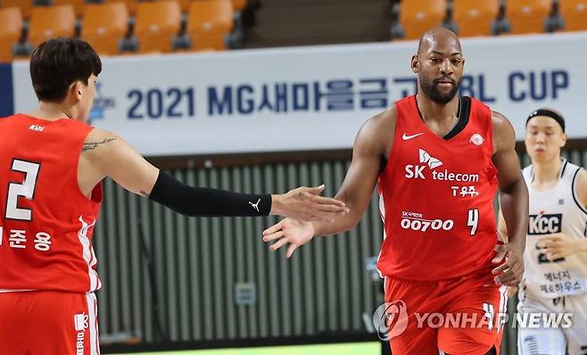 (상주=연합뉴스) 이진욱 기자 = 13일 경북 상주체육관에서 열린 2021 MG 새마을금고 KBL컵대회 서울 SK와 전주 KCC 경기. SK 최준용이 슛을 성공시킨 리온 윌리엄스와 하이파이브를 하고 있다. 2021.9.13