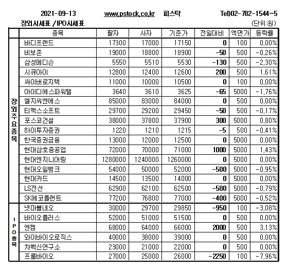 바이오플러스(5만1500원), 와이바이오로직스(3만9000원), 차백신연구소(2만2000원), 엘지씨엔에스(8만4000원), 한국증권금융(1만2500원), 현대엔지니어링(126만원), 한국코러스(8만8000원), 퓨쳐메디신(2만5000원), 솔젠트(1만1000원) 등 장외종목은 주가변동없이 장을 마감했다.