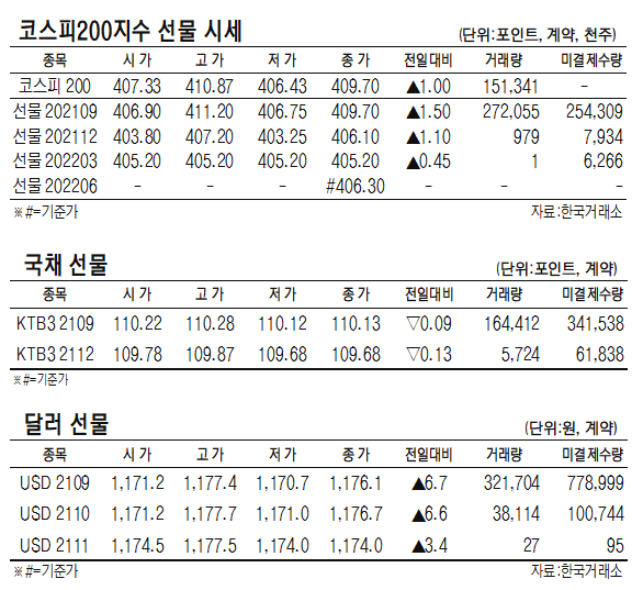 - [표]코스피200지수 ·국채·달러 선물 시세(9월 9일)