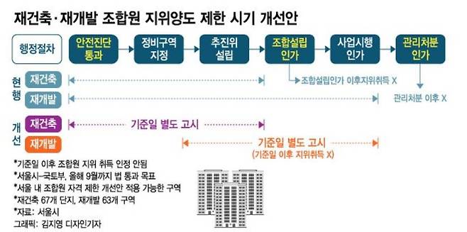 개정안은 국토부가 아닌 오세훈 시장이 적극 추진했다는 점에서 시장의 기대와 관심을 받았다. 서울 도심내 재건축 사업 진도를 빼면서 투기수요를 조기 차단할 수 있는 장치로 토지거래허가구역 확대에 이어 오세훈표 '투기방지책'으로 꼽혔기 때문이다. 조합원 지위 양도 제한 시기가 당겨지면 실거주 목적이 아니라 시세차익만 노린 아파트 매매를 차단할 수 있다. 확실한 투기방지책이 2개나 작동하는 셈이라 재건축을 막아왔던 국토부도 오 시장과 합의해 추진키로 합의했다.