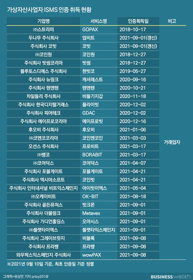 이에 국민들이 가상자산사업자 신고준비 현황을 확인할 수 있도록 지난달 25일 ISMS 인증획득 현황 명단을 처음 공개한 바 있다.
