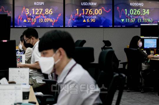 코스피가 전 거래일 대비 2.10포인트 오른 3127.86으로 장을 마친 13일 서울 중구 하나은행 딜링룸에서 직원들이 분주히 업무를 보고 있다. 이날 코스닥은 11.57포인트 내린 1026.34, 원·달러 환율은 6.9원 오른 1176.0원으로 마감했다.