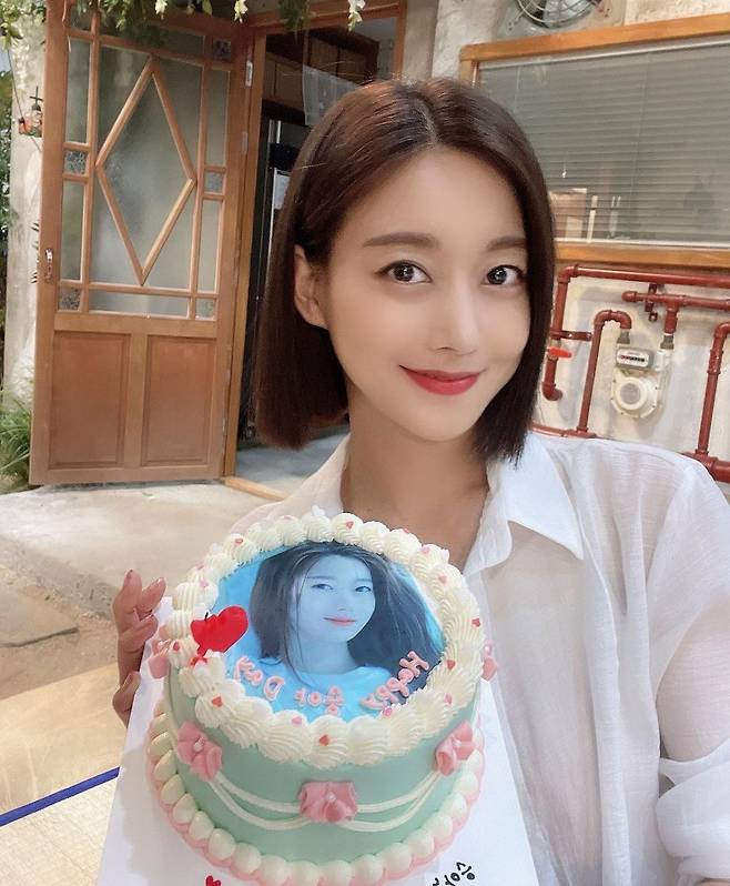공개된 사진에는 단발로 변신한 오승아가 자신의 얼굴이 담긴 케이크를 들고서 셀카를 찍는 모습이 담겼다.