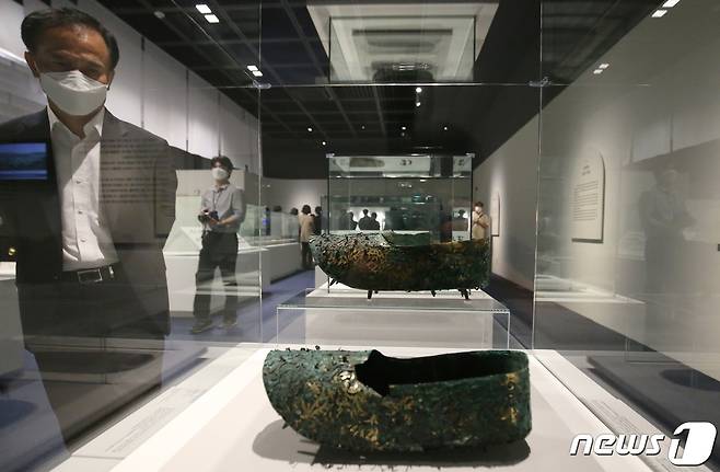 (공주=뉴스1) 김기태 기자 = 13일 충남 공주 국립공주박물관에서 무령왕릉 발굴 50주년을 맞아 열린 특별전에 '금동 신발'이 전시돼 있다.