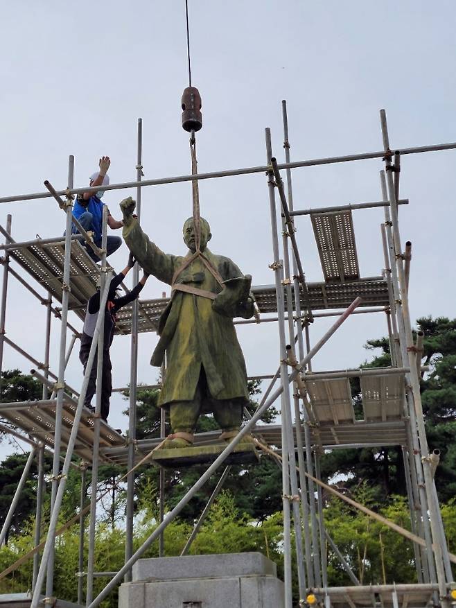 전북 정읍시가 친일 작가 작품으로 지적돼온 황토현전적지(사적 제295호) 내 전봉준장군 동상과 부조를 13일 철거했다.