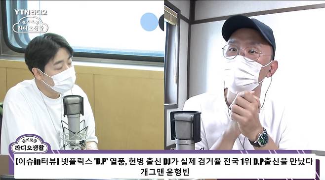 13일 YTN라디오 '슬기로운 라디오생활'에 출연한 윤형빈은 자신이 D.P에 선출된 사연과 D.P로서의 군 생활, 탈영병 검거과정을 생생하게 전달해 최근 D.P에 대한 청취자들의 관심과 궁금증을 해소시켰다.