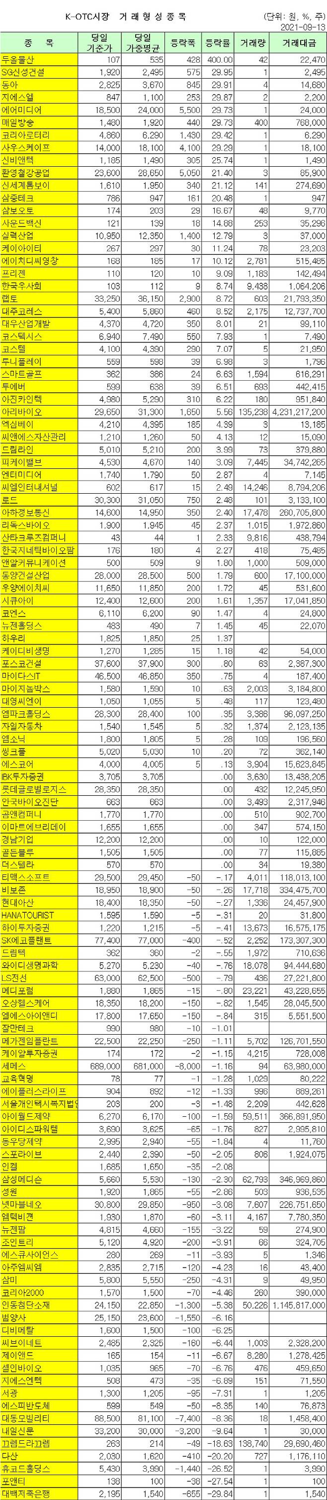 [이데일리 유준하 기자] 다음은 9월13일 K-OTC 시장 거래 현황이다.