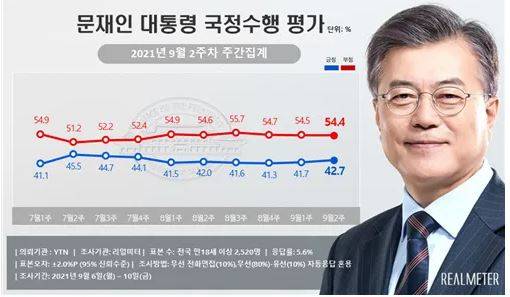 According to a YTN survey conducted by the polling firm, Realmeter, on September 6-10 of 2,520 voters ages 18 and older nationwide, 42.7% had a positive assessment of President Moon’s handling of state affairs (24.1% very good, 18.6% fairly good), while 54.4% had negative views (14.3% fairly bad, 40.1% very bad), and 2.9% said they did not know or did not answer. Positive views on the president increased 1% from the previous week, and negative views dropped 0.1%.