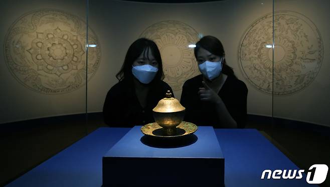 (공주=뉴스1) 김기태 기자 = 13일 충남 공주 국립공주박물관에서 무령왕릉 발굴 50주년을 맞아 열린 특별전 개막식에서 참석자들이 '받침 있는 은잔'을 바라보고 있다.