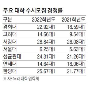 이날 원서 접수를 마감한 대학별 경쟁률은 △경희대 22.92대1 △서강대 28.84대1 △성균관대 24.31대1 △한양대 25.67대1 등으로 집계됐다. 서울 주요 대학 7개교의 전체 수시모집 경쟁률은 지난해 16.1대1에서 올해 18.67대1로 높아졌다.
