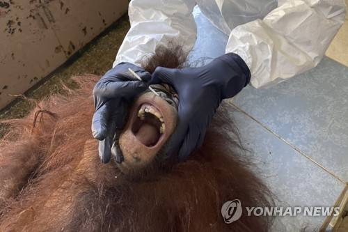 epa09464970 An undated handout photo made available the Malaysia Sabah Wildlife Department on 13 September 2021 shows a veterinarian wearing personal protective equipment collect a swab sample from an orangutan for Covid-19 coronavirus testing at the Sepilok Orangutan Rehabilitation Centre in Sandakan, Sabah island of Borneo of Malaysia. The test results have found that all 30 orangutans are negative for Covid-19, according to Director of Sabah Wildlife Department Augustine Tuuga EPA/MALAYSIA'S SABAH WILDLIFE DEPARTMENT HANDOUT HANDOUT EDITORIAL USE ONLY/NO SALES