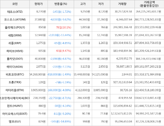 또한, 세럼(-13.44%, 12,940원), 코스모스(-9.62%, 37,880원), 아이오에스티(-9.26%, 79.4원), 비트코인캐시에이비씨(-8.71%, 238,350원), 에이다(-7.11%, 2,875원), 트론(-5.19%, 128원), 폴카닷(-4.87%, 40,800원), 리플(-4.85%, 1,275원), 헌트(-4.14%, 880원), 이더리움(-4.08%, 3,905,000원), 테조스(-1.72%, 8,270원)가 하락세를 나타냈다.