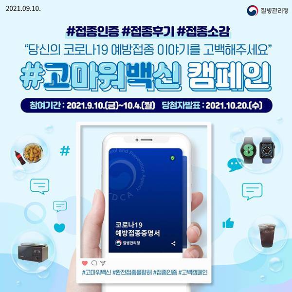 코로나19 예방접종 대응 추진단이 코로나19 예방접종 인증과 소감을 선정하는 '#고마워백신' 온라인 캠페인을 오는10일부터 10월 4일까지 진행한다.
