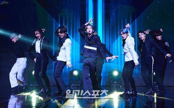 에이티즈(홍중, 성화, 윤호, 여상, 산, 민기, 우영, 종호) 멤버들이 멋진 무대를 선보이고 있다. <사진=KQ엔터테인먼트 제공>