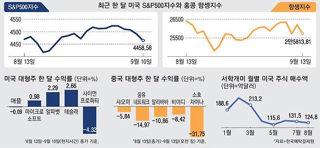 이달 들어 뉴욕 증시에서는 S&P500 지수가 1.42% 하락하면서 마이너스로 돌아섰다. 해당 지수는 지난 8월 한 달간 2.9%, 올해 1월 이후 연간으로 20.48% 상승했지만 이달에는 하락세를 보인 것이다. 이처럼 기류가 가라앉은 것은 기술 대장주인 'MAGAT'(마이크로소프트·아마존·구글 알파벳·애플·테슬라)와 경기순환 대장주로 꼽히는 미국 내 최대 상업용 부동산업체 사이먼 프로퍼티 등의 주가가 고전하고 있기 때문이다. 홍콩·중국 본토 증시에서도 '중국판 애플' 샤오미를 비롯해 '중국판 마이크로소프트' 융유네트워크, '중국판 아마존' 알리바바, '중국판 테슬라' 비야디 주가가 줄줄이 마이너스 수익률을 기록했다. 해외 투자자가 많은 홍콩 항셍 지수는 지난달 0.26%로 약보합세였다가 이달 1.38% 떨어졌다. 한국예탁결제원에 따르면 국내 투자자들의 해외 주식 매수액 중 미국과 홍콩·중국 증시 비중은 98%를 넘어선다. 서학개미의 양대 텃밭으로 꼽히는 뉴욕 증시와 중국 증시가 조정 불안감에 휩싸이면서 미·중 주식을 사들였던 개인투자자들은 매매 전략을 고심하는 분위기다. 이미 서학개미의 미·중 투자 흐름은 한풀 꺾였다.