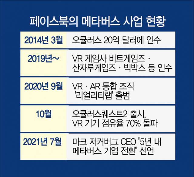 한편 페이스북은 소셜네트워크(SNS) 사업을 넘어서 메타버스 기업으로의 전환을 꾀하고 있다. 마크 저커버그 페이스북 최고경영자(CEO)는 지난 7월 “스마트폰은 사람들이 상호작용할 수 있도록 만들어지지 않았다”며 “향후 5년 내 페이스북을 메타버스 기업으로 진화시키겠다”고 밝혔다. 페이스북은 이를 위해 지난 2014년 VR 기기 제조사인 ‘오큘러스’를 20억 달러(약 2조3000억 원)에 인수했다. 오큘러스는 올 1분기 글로벌 VR·AR 기기 출하량 점유율 75%를 차지하고 있다. 페이스북은 최근 룩소티카와 함께 스마트글라스 ‘레이밴 스토리’를 공개하기도 했다.