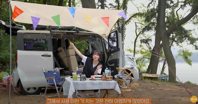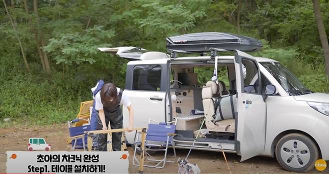 먼저 초아는 미니 테이블을 설치 후 자동차 문을 열고 기둥과 함께 타프를 설치했다. 마지막으로 취향껏 감성을 더해 분위기 있는 캠핑카 세팅을 완료했다.