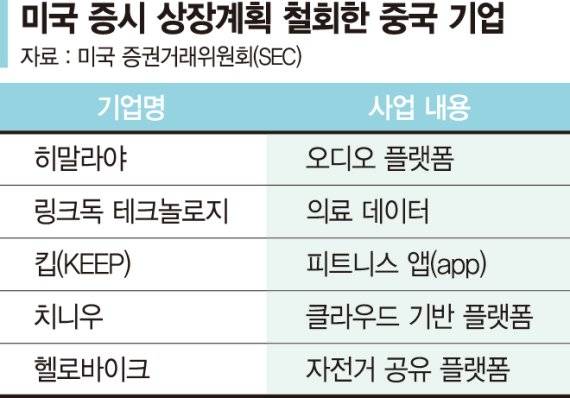 이에 앞서 지난 7월에는 중국 의료데이터 기업 링크독 테크놀로지를 시작으로 피트니스 앱(app) 운영기업 킵, 알리바바그룹의 지원을 받은 클라우드 기반 플랫폼 업체 치니우, 자전거 공유 플랫폼 업체 헬로바이크 등이 미 증시 상장을 철회한 바 있다.