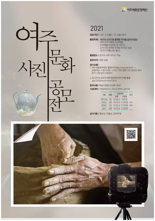 경기 여주세종문화재단이 여주시 고유의 문화예술인 도자예술 활성화를 위해 이달 6일부터 오는 10월 3일까지 한 달간 여주의 도자기와 함께한 모습을 주제로 '2021여주 문화 사진공모전'을 개최한다.