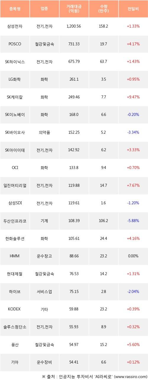 삼성전자, POSCO, SK하이닉스 등은 전일 대비 주가가 상승했고, SK이노베이션, SK바이오사이언스, 삼성SDI 등은 주가가 하락했다.