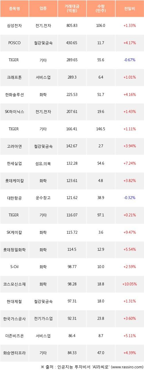 삼성전자, POSCO, 크래프톤 등은 전일 대비 주가가 상승했고, TIGER 미국S&P500선물(H), 대한항공 등은 주가가 하락했다.