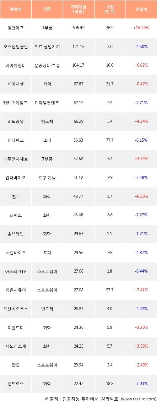 엘앤에프, 에이치엘비, 네이처셀 등은 전일 대비 주가가 상승했고, 오스템임플란트, 카카오게임즈, 인터파크 등은 주가가 하락했다.