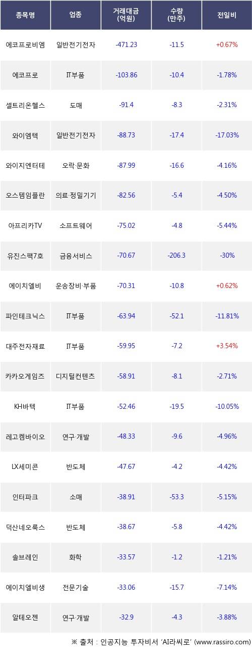 [09월13일]코스닥 기관 순매도 상위 종목