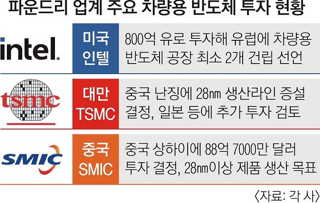 차량용 반도체 시장 공략에 나선 것은 인텔만이 아니다. 파운드리(반도체 위탁생산) 점유율 1위인 대만 TSMC와 중국 최대 파운드리 기업인 SMIC는 차량용 반도체 생산 공장을 각각 난징과 상하이에 건립하겠다고 최근 밝힌 바 있다. 업계에선 SMIC가 차량용 반도체를 놓고 자국 내에서 TSMC에 도전장을 내민 것이란 해석이 나왔다.