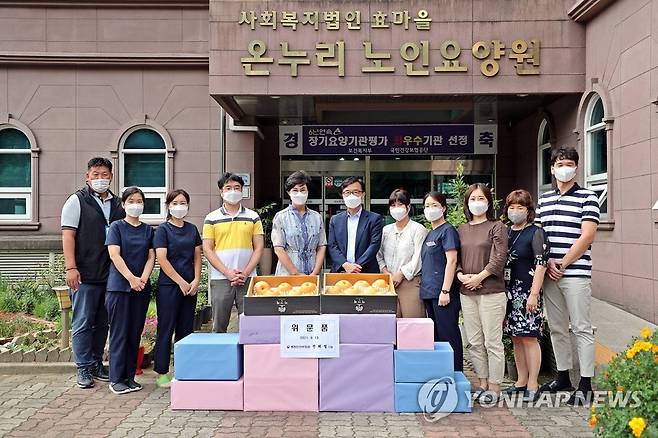 (서울=연합뉴스) 13일 오후 추석 연휴를 앞두고 대전광역시 동구 '온누리 노인요양원'을 찾은 김종범 행정안전부 운영지원과장(가운데)이 전해철 장관을 대리해 위문품을 전달하고 기념 촬영을 하고 있다. 2021.9.13