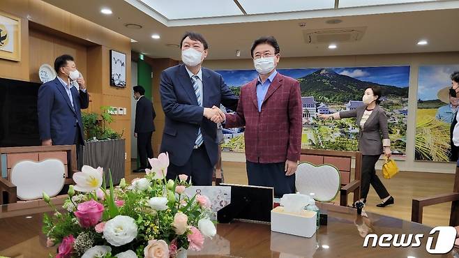 (안동=뉴스1) 김대벽 = 국민의힘 대권주자인 윤석열 전 검찰총장이 13일 오후 경북도청을 방문해 이철우 경북도지사와 악수하고 있다. 2021.9.13/뉴스1