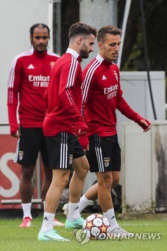 epa09465105 Benfica players (L-R) Valentino Lazaro, Rafa Silva, and Alejandro Grimaldo attend their team's training session at Benfica's training camp in Seixal, Portugal, 13 September 2021. Benfica Lisbon will face Dynamo Kiev in their UEFA Champion League group E soccer match on 14 September 2021. EPA/MIGUEL A. LOPES
