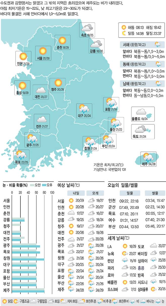 [14일의 날씨] 중부 맑은하늘, 남부 비구름