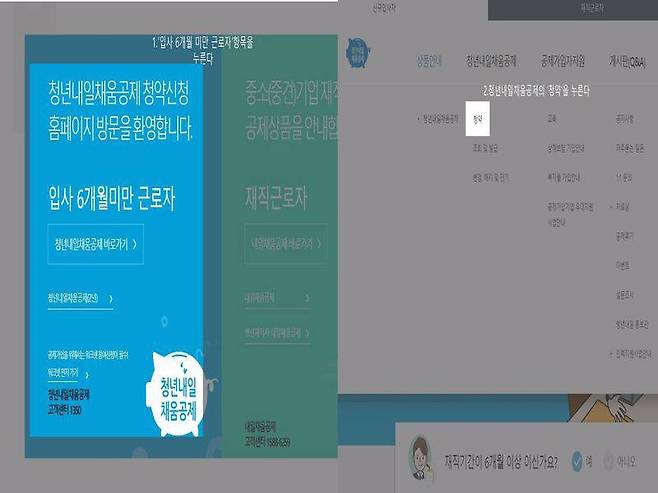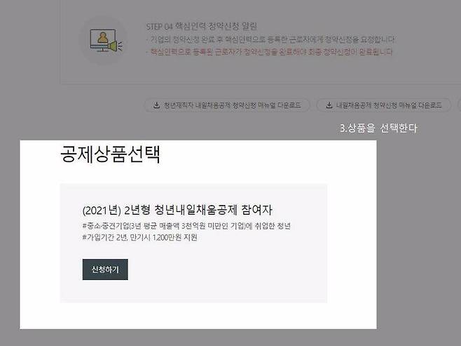청년공제 청약 홈페이지에 들어가서, 입사 6개월 미만 근로자 항목을 선택한다. 그리고 청년내일채움공제 메뉴에서 ‘청약’에 들어간 뒤, 하단에 있는 상품 선택을 누르면 된다.