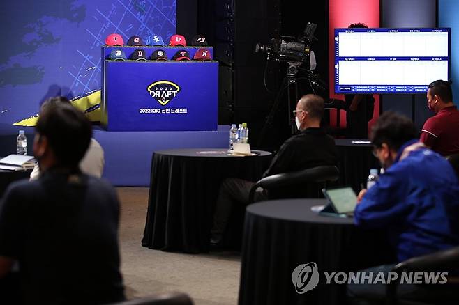 (서울=연합뉴스) 13일 오후 서울 용산구 블루스퀘어에서 열린 '2022 KBO 신인 드래프트'가 코로나19 확산 방지를 위해 비대면 방식으로 진행되고 있다. 2021.9.13 [KBO 제공. 재판매 및 DB 금지]