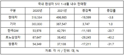외자계 3사는 최근 노사간 임단협이 마무리되면서 수출 우려도 어느 정도 해소된 모습이다. 하지만 반도체 부족 여파 및 현대차·기아에 비해 신차 경쟁력이 약하다는 점에서 내수 시장에서는 고전을 면치 못하고 있다. 외자계 3사의 올 1~8월 국내 판매량은 11만8331대로 작년 동기 대비 32.8% 감소해, 같은 기간 현대차·기아(-1.8%)와 격차가 더욱 벌어졌다.특히 르노삼성의 경우 올해 수출 실적이 작년보다 126.5%(2만892대) 크게 늘었지만 내수 부진으로 전체 판매량은 9.9%(8353대) 줄어 국내 시장에서의 판매 회복이 시급한 상황이다.