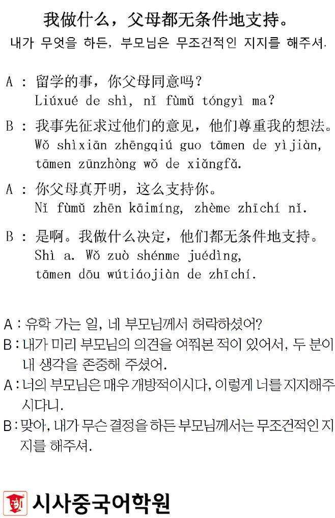 [시사중국어학원의 리얼 중국어 회화] 내가 무엇을 하든, 부모님은 무조건적인 지지를 해주셔.