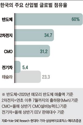 그런 맥락에서 보면 국내 반도체, 전기차(+이차전지), 바이오 위탁생산(CMO), 조선은 미국 공급망과 밀접하게 연동되어 있거나 전 세계에서 과점적 지위를 가진 산업이다. 향후 미·중 간 기술 경쟁이 격화될수록 오히려 이들 산업의 공급망 협업이 강화되거나 강대국 간 분쟁으로부터 자유로울 수 있는 산업이다.