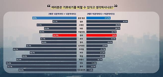 조사에 따르면 일생 동안 기후변화를 막을 수 있다고 생각하는지에 대한 질문에 한국 소비자의 34%는 '매우 비관적' 또는 '비관적'이라고 답해 매우 낙관적이거나 다소 낙관적이라는 응답(24.9%)보다 많았다.