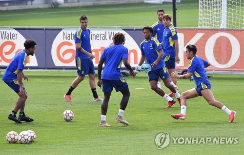 epa09465281 Juventus players perform during their team's training session in Turin, Italy, 13 September 2021. Juventus FC will face Malmo FF in their UEFA Champions League group H soccer match on 14 September 2021. EPA/Alessandro Di Marco