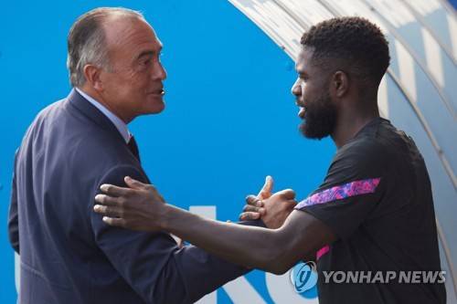 epa09465311 FC Barcelona's vice president Rafael Yuste (L) greets Samuel Umtiti (R) during their team's training session at Joan Gamper Sports Complex in Barcelona, Spain, 13 September 2021. FC Barcelona will face Bayern Munich in their UEFA Champions League group E soccer match on 14 September 2021. EPA/Alejandro Garcia