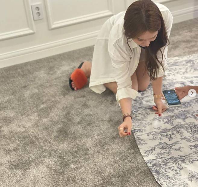 공개된 사진 속 이혜원은 무릎을 꿇고 앉아 원단의 패턴을 살펴보는 모습. 옆에 있는 직원은 분주히 이를 카메라에 담으며 일을 보조하고 있는 모습.